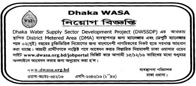Dhaka Water Supply and Sewerage Authority (WASA) has invited applications vide memo no: 46.113.208.00.13.018.2016-1904, dated: 24.11.2016 from bona fide Bangladesh citizens to fill out 17 (seventeen) nos. of vacant positions for 2 years. Interested applicants have been requested to apply apply as per prescribed form available from Dhaka WASA web site www.dwasa.org.bd . The following are some important guidelines for the applicants: